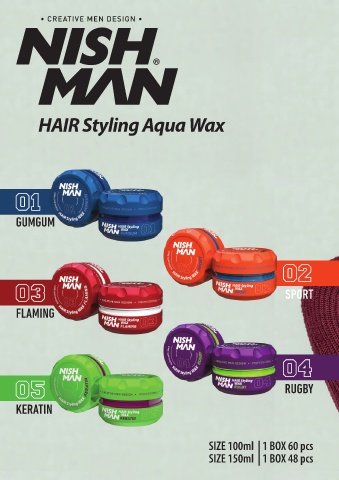 HAIR Styling Aqua Wax 01 GUMGUM 02 03 SPORT FLAMING 04 05 RUGBY KERATIN SIZE 100ml | 1 BOX 60 pcs SIZE 150ml | 1 BOX 48 pcs