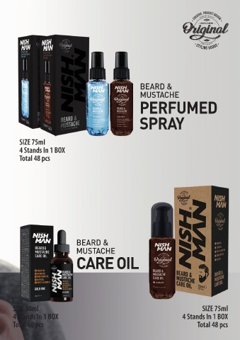 BEARD & MUSTACHE PERFUMED SPRAY SIZE 75ml 4 Stands In 1 BOX Total 48 pcs BEARD & MUSTACHE CARE OIL SIZE 30ml SIZE 75ml 4 Stands In 1 BOX 4 Stands In 1 BOX Total 60 pcs Total 48 pcs